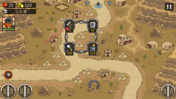 3、進(jìn)入關(guān)卡后,消耗金幣建造造價(jià)70、100、125的不同類型防御塔,準(zhǔn)備應(yīng)對0/8波的敵人進(jìn)攻。