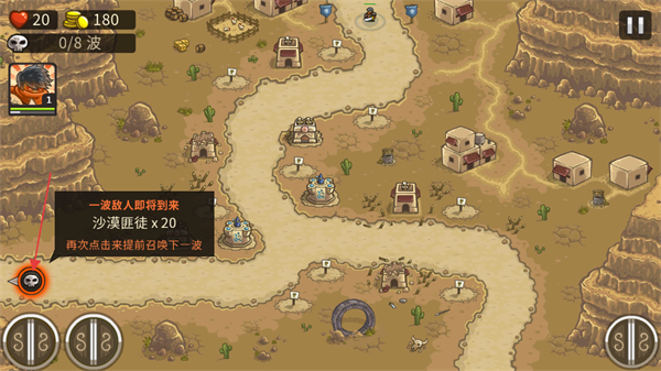 4、點(diǎn)擊左側(cè)紅色按鈕后出現(xiàn)一波敵人即將到來沙漠匪徒x20提示時(shí),做好防御部署,也可再次點(diǎn)擊來提前召喚下一波敵人。