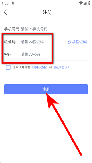 4、輸入驗證碼及密碼,勾選協(xié)議后,點擊注冊,完成注冊操作。