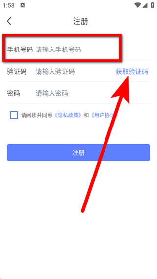 3、在注冊頁面,輸入手機號碼,點擊獲取驗證碼。