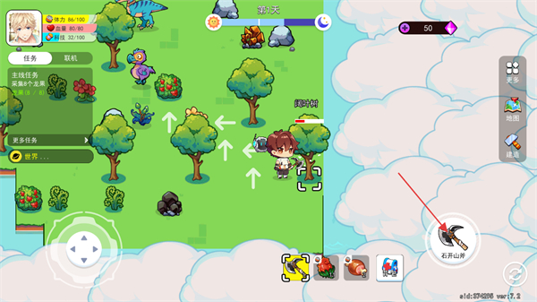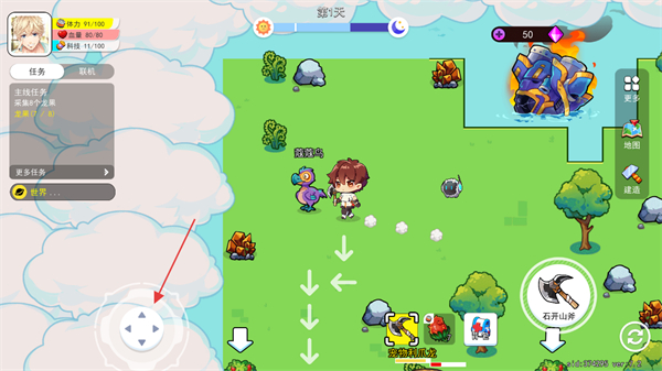 2、通過(guò)方向鍵控制角色移動(dòng),主線任務(wù)為采集8個(gè)龍果,同時(shí)可使用道具、互動(dòng)寵物,完成采集類任務(wù)推進(jìn)游戲。