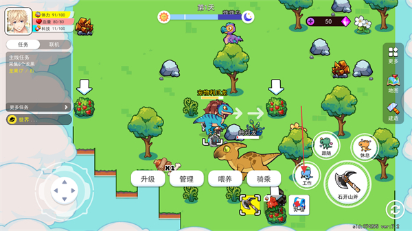 3、該界面可對(duì)寵物進(jìn)行操作,包含升級(jí)、管理、喂養(yǎng)、騎乘等功能,點(diǎn)擊工作按鈕可讓寵物協(xié)助完成資源采集等任務(wù)。