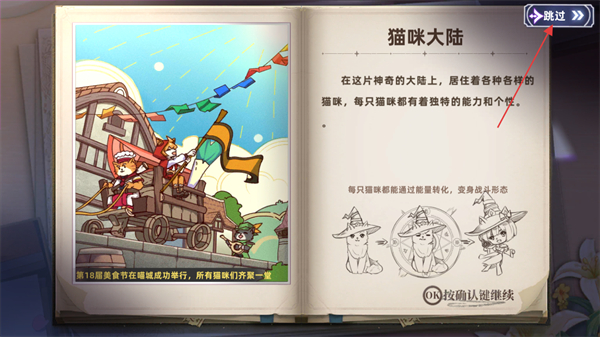 2、進(jìn)入游戲后會(huì)展示貓咪大陸的背景設(shè)定,可點(diǎn)擊右上角跳過(guò)快速略過(guò)劇情或閱讀后點(diǎn)按確認(rèn)鍵繼續(xù)來(lái)推進(jìn)游戲流程。
