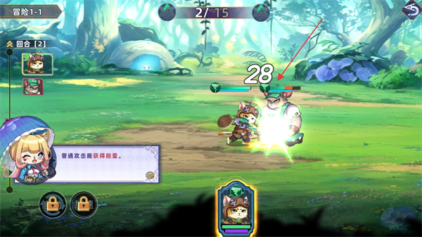 4、在冒險(xiǎn)1-1戰(zhàn)斗關(guān)卡中,執(zhí)行普通攻擊操作攻擊后會(huì)顯示傷害數(shù)值,以此推進(jìn)關(guān)卡進(jìn)程。