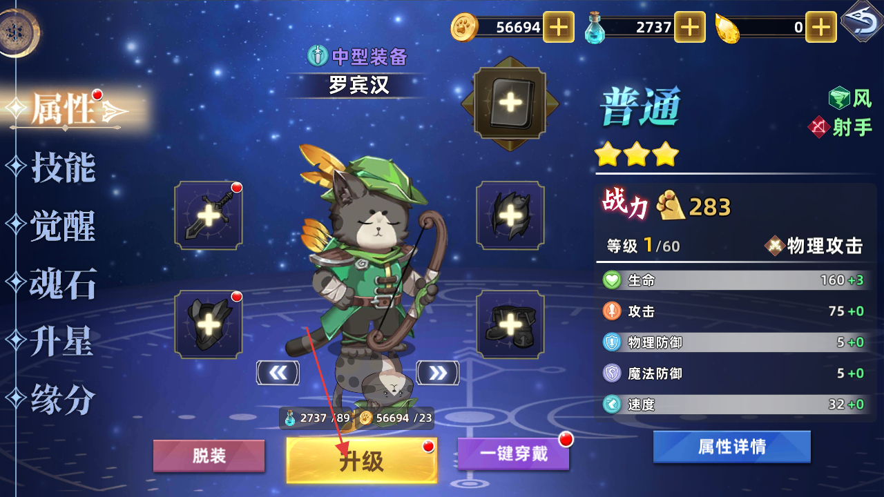 1、在羅賓漢的角色界面中可點(diǎn)擊升級(jí)按鈕,消耗對(duì)應(yīng)資源提升角色等級(jí),還能通過(guò)一鍵穿戴配置裝備來(lái)增強(qiáng)該角色的戰(zhàn)力屬性。