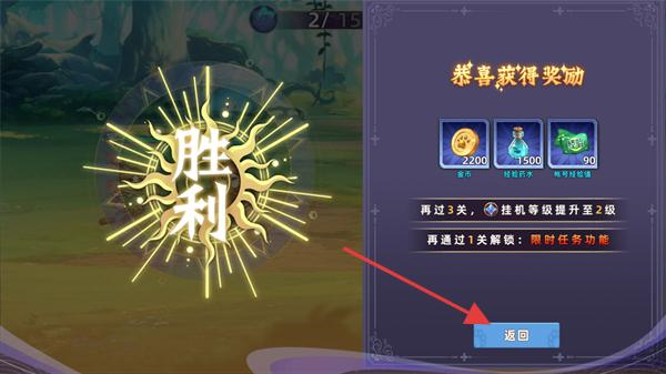 4、冒險(xiǎn)關(guān)卡戰(zhàn)斗獲得勝利并顯示獎(jiǎng)勵(lì)內(nèi)容后,點(diǎn)擊界面中的返回按鈕,即可回到冒險(xiǎn)界面繼續(xù)挑戰(zhàn)后續(xù)的相關(guān)關(guān)卡。