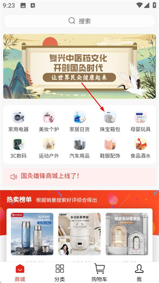 1、在國灸雄鋒首頁,點(diǎn)擊珠寶箱包分類選項(xiàng),進(jìn)入珠寶箱包商品列表頁面。