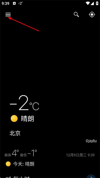 1、在天氣首頁(yè)點(diǎn)擊左上角的菜單按鈕,進(jìn)入菜單頁(yè)面。