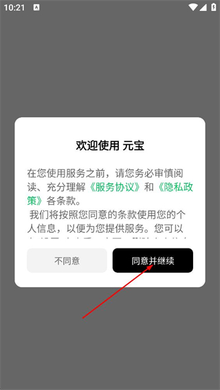 1、在騰訊元寶歡迎使用彈窗中,閱讀服務(wù)協(xié)議和隱私政策后,點(diǎn)擊同意并繼續(xù)。