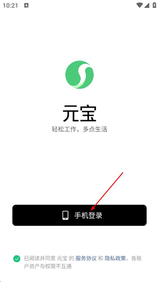 2、進(jìn)入騰訊元寶的主登錄頁后,點(diǎn)擊頁面中的手機(jī)登錄,進(jìn)入手機(jī)號(hào)登錄界面。