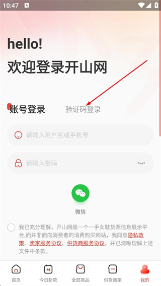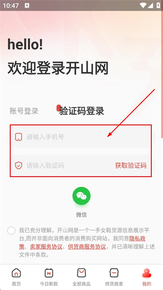 3、在驗證碼登錄頁,填寫手機號與驗證碼,勾選相關協(xié)議后。完成登錄操作。