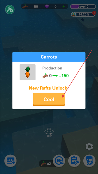 4、建造完成后彈出提示,點(diǎn)擊Cool確認(rèn),解鎖新木筏區(qū)域,推進(jìn)通關(guān)進(jìn)程。