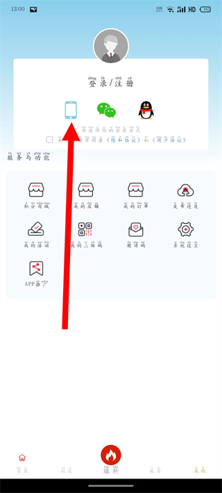2、在我的頁(yè)面,點(diǎn)擊登錄注冊(cè)手機(jī)圖標(biāo),進(jìn)入賬號(hào)登錄界面。
