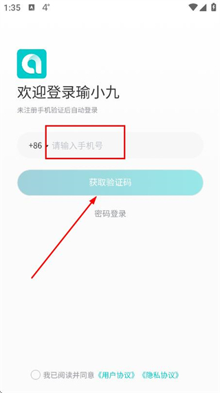 2、在手機登錄頁面填寫手機號,勾選協(xié)議后,點擊獲取驗證碼。