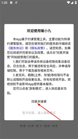 1、在使用協(xié)議隱私政策彈窗中點擊同意并接受,進入登錄頁面。