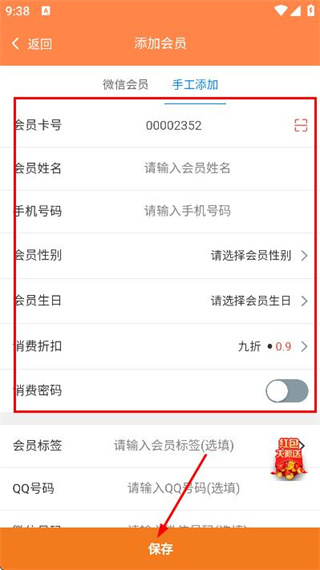 3、在手工添加會員的表單頁面填寫信息后,點擊保存按鈕完成會員添加操作。