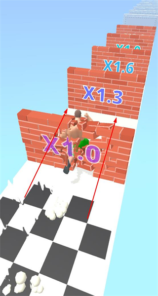 2、沖刺撞擊帶有倍數(shù)標(biāo)識(shí)的磚墻,獲取對(duì)應(yīng)倍數(shù)加成,提升關(guān)卡結(jié)算收益。