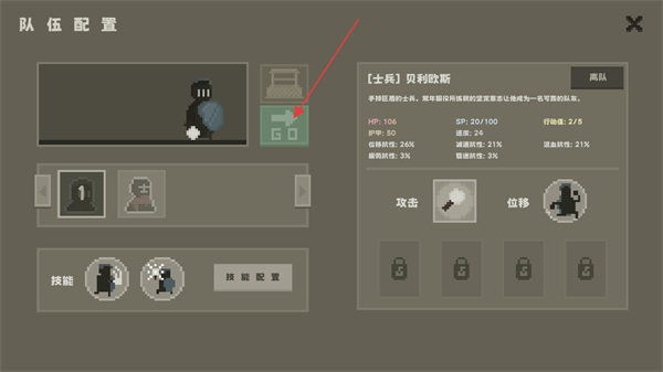 3、在隊(duì)伍配置界面,可查看士兵貝利歐斯的屬性,還能進(jìn)行技能配置來(lái)調(diào)整隊(duì)伍的備戰(zhàn)狀態(tài)。