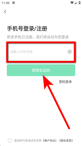 3、在手機(jī)號登錄注冊頁面,輸入手機(jī)號碼,點(diǎn)擊獲取驗(yàn)證碼。