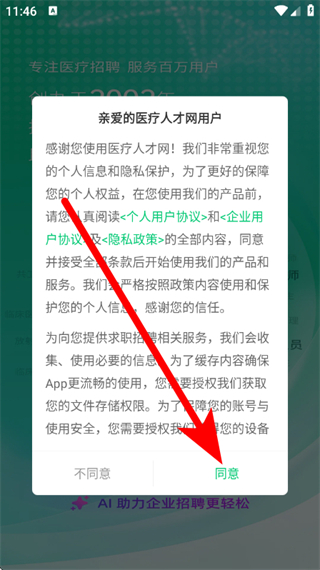 1、打開中國醫(yī)療人才網(wǎng),在彈出的用戶協(xié)議彈窗中,點(diǎn)擊同意。