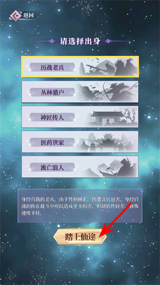 2、進入出身選擇界面后,選定對應(yīng)的出身類型,點擊踏上仙途按鈕,這是確定角色初始背景的基礎(chǔ)操作,會對應(yīng)不同的初始屬性與成長傾向。