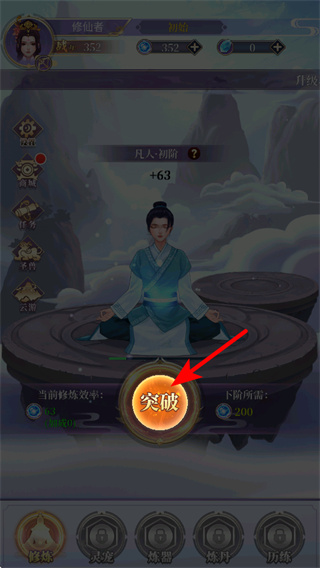 3、進入修煉場景后,點擊突破按鈕,這是提升角色境界的核心操作,消耗對應(yīng)資源后角色的修為會得到提升,解鎖更強的能力與修煉內(nèi)容。