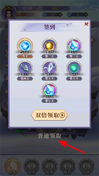 4、當(dāng)簽到界面彈出時,點擊普通領(lǐng)取按鈕,這是獲取每日獎勵的重要操作,領(lǐng)取后可獲得對應(yīng)的資源道具,助力角色的修煉與成長進度。
