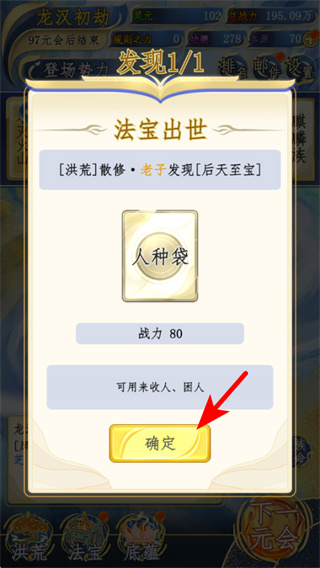 3、當(dāng)法寶出世的提示界面彈出時,點(diǎn)擊確定按鈕,這是獲取法寶并提升戰(zhàn)力的核心操作,確認(rèn)后法寶會加入勢力體系,增強(qiáng)整體的戰(zhàn)斗能力。