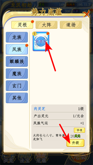 4、進(jìn)入勢力底蘊(yùn)界面后,選擇靈根道具,點(diǎn)擊升級按鈕,強(qiáng)化資源產(chǎn)出的重要操作,升級后靈根的資源產(chǎn)出效率會提升,加速勢力的發(fā)展進(jìn)度。