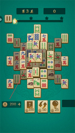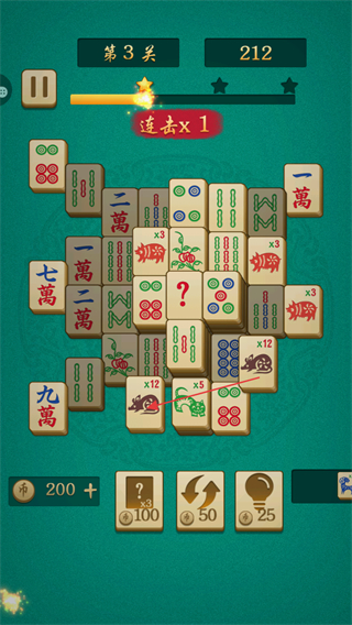 1、在第3關(guān)中,點(diǎn)擊相同圖案的麻將牌消除,觸發(fā)連擊x1,分?jǐn)?shù)升至212。