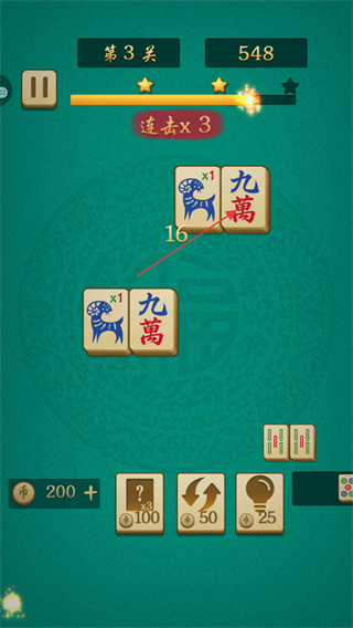 3、持續(xù)消除相同牌,觸發(fā)連擊x3,分?jǐn)?shù)漲至548,靠近通關(guān)條件。