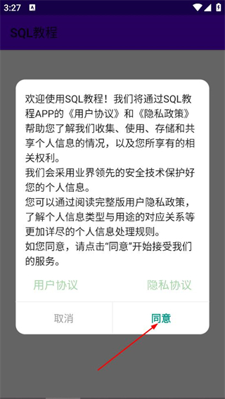1、在SQL教程的協(xié)議彈窗中,點擊同意,進入SQL教程主頁面。