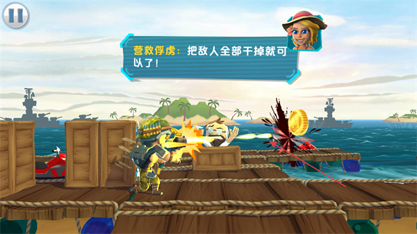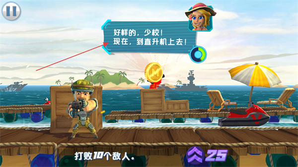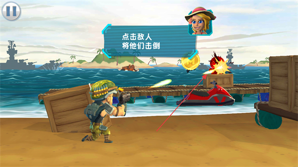 1、在海灘場景中,操控角色射擊敵人,按提示推進戰(zhàn)斗。