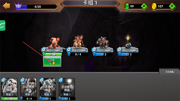 2、進(jìn)入卡組1界面,可查看已選的1級勇士等單位,點擊對應(yīng)單位的升級選項優(yōu)化出戰(zhàn)配置。