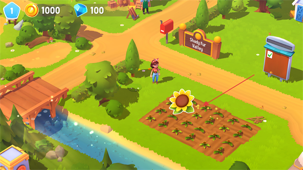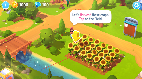 1、根據(jù)界面角色給出的提示,點(diǎn)擊對(duì)應(yīng)的向日葵農(nóng)田區(qū)域,觸發(fā)作物收割的交互流程。