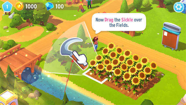 2、按照提示要求,將鐮刀工具拖拽到農(nóng)田區(qū)域,完成向日葵作物的收割操作。