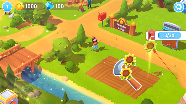 3、收割完成后向日葵會(huì)被自動(dòng)收集,右上角進(jìn)度條顯示收集量3/30,農(nóng)田區(qū)域隨之清空,完成本輪收割的資源收集環(huán)節(jié)。
