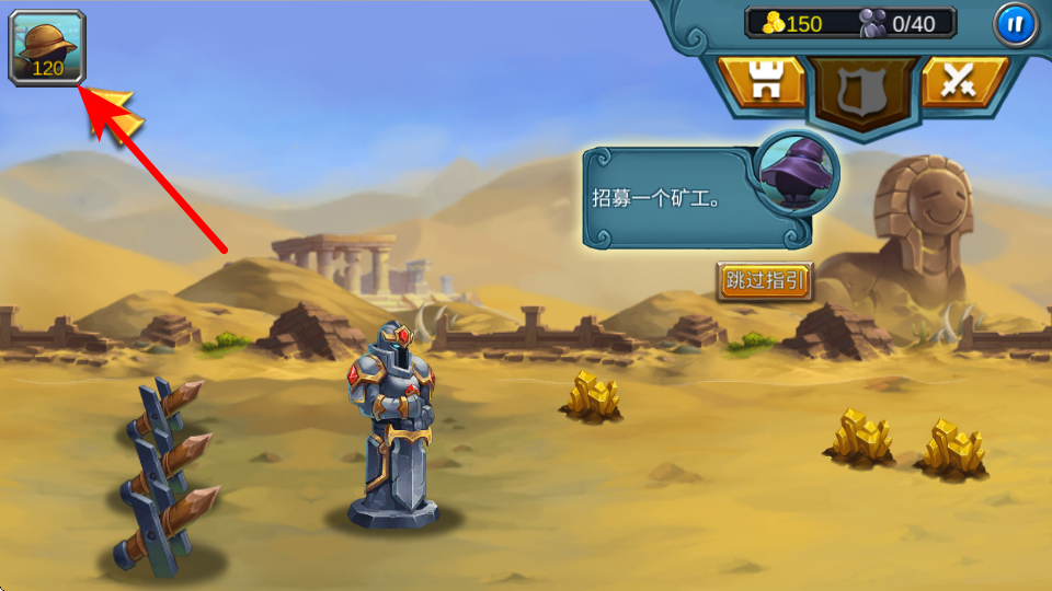 2、進(jìn)入戰(zhàn)場界面后,根據(jù)指引點(diǎn)擊招募礦工的選項(xiàng),這是積累資源的基礎(chǔ)操作,可采集金幣,為后續(xù)的兵種訓(xùn)練防御建設(shè)提供物資支持。