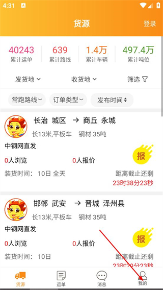 2、在物流寶貨源頁面,點擊底部我的,進入登錄相關界面。