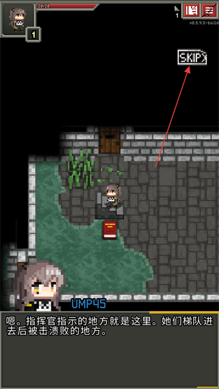 3、進(jìn)入游戲后會顯示劇情對話,點(diǎn)擊界面右上角的SKIP按鈕,可跳過這段劇情對話,快速進(jìn)入地牢的探索場景。