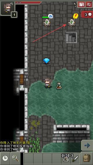 4、進(jìn)入地牢后在左下角的信息框會提示你踏入了地牢的第1層,注意地圖內(nèi)的怪物,如果驚動了他們會出現(xiàn)感嘆號標(biāo)志。