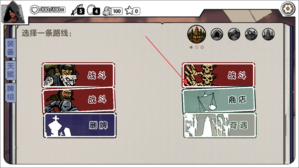 2、進入游戲后會進入路線選擇界面,從左右倆條路線中選擇一個節(jié)點,推進游戲的探索流程。
