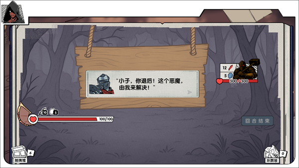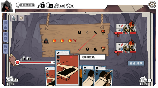 4、戰(zhàn)斗環(huán)節(jié)界面會展示可用卡牌,同時右側(cè)顯示敵方狀態(tài)信息,通過使用卡牌完成攻擊、防御等操作,操作后點擊回合結(jié)束推進戰(zhàn)斗。