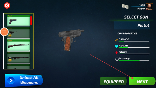 1、在武器選擇界面,挑選手槍Pistol并點(diǎn)擊NEXT進(jìn)入戰(zhàn)場(chǎng)。