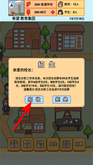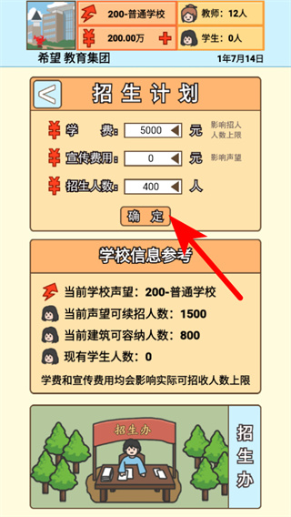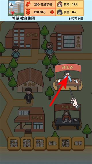 2、點(diǎn)擊招生辦區(qū)域,這是啟動(dòng)招生流程的基礎(chǔ)操作,進(jìn)入后可設(shè)置學(xué)費(fèi)、宣傳費(fèi)用等招生參數(shù),為學(xué)校吸納學(xué)生做準(zhǔn)備。
