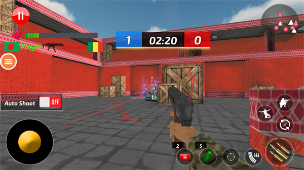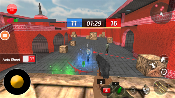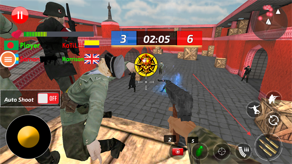 1、在戰(zhàn)場中利用木箱等掩體躲避敵方攻擊,同時瞄準(zhǔn)敵方目標(biāo)射擊,積累擊殺數(shù)。