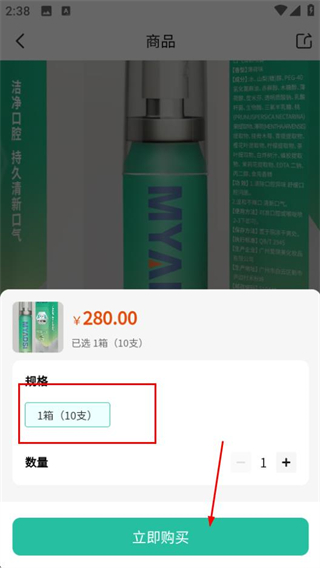 3、在詳情頁,點擊立即購買按鈕,進入規(guī)格數(shù)量選擇窗口。