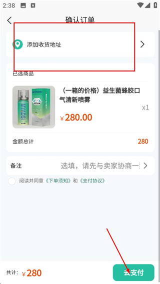 5、在確認訂單頁面,添加收貨地址并勾選協(xié)議后,點擊去支付完成購買。
