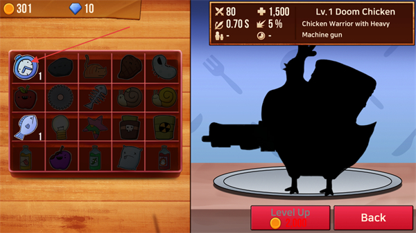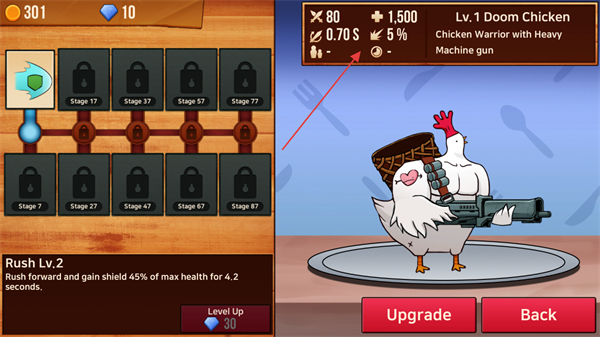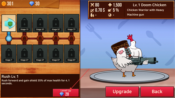 2、此界面是角色升級頁面,當前角色為Lv.1DoomChicken,其RushLv.1技能可獲得護盾,點擊LevelUp消耗20鉆石提升技能。