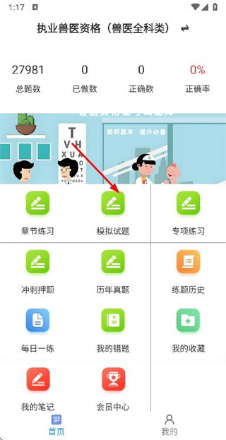 1、在執(zhí)業(yè)獸醫(yī)資格首頁(yè)點(diǎn)擊模擬試題選項(xiàng),進(jìn)入模擬試題分類頁(yè)面。